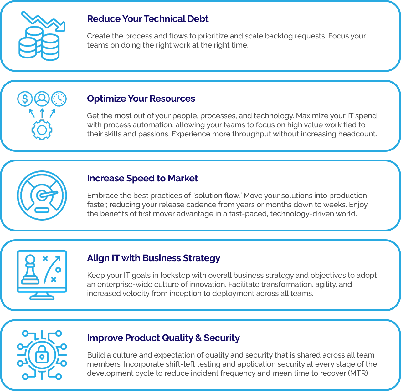 Keep your IT goals in lockstep with overall business strategy and objectives to adopt an enterprise-wide culture of innovation. Facilitate transformation, agility, and increased velocity from inception to deployment across all teams.