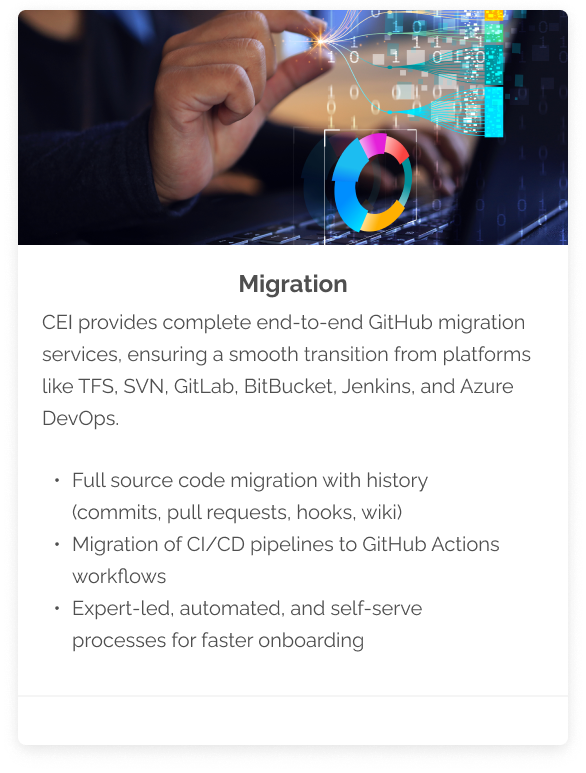 As a GitHub Advanced Partner, the CEI team has experience across a wide array of DevOps tools and client experience that spans nearly every major industry, allowing us to deliver unique solutions customized for your success. By hiring talented team members, using the correct tools, and implementing the right processes, you will experience efficiencies through automation, increased business value, and a culture of empowerment, quality, and innovation.
